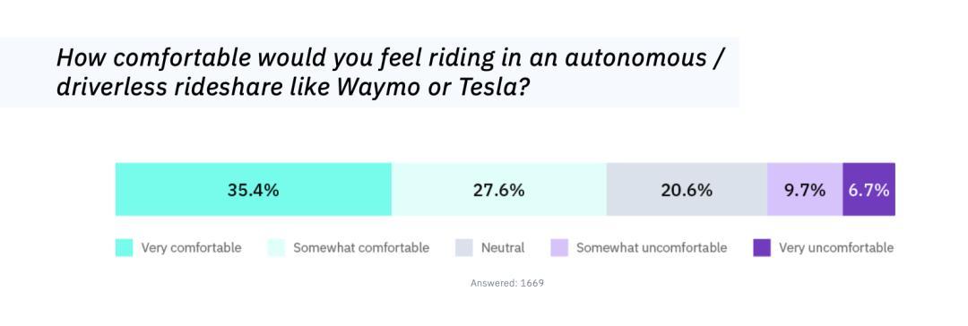而且,近一半的受访者表示,自动驾驶汽车未来可能成为他们的主要出行方式。其中,对于使用Robotaxi接送孩子,有57%的男性表示会信任它,而女性为47%。