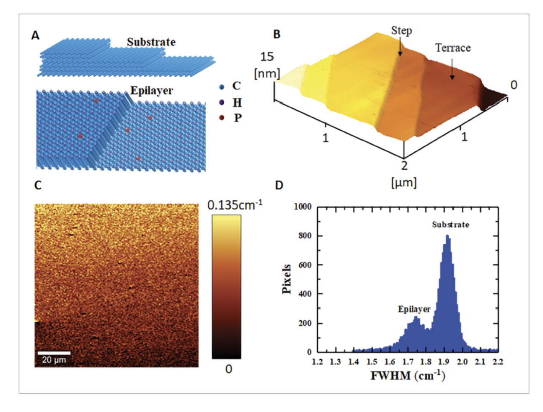 通过原子力显微镜(AFM:atomic force microscopy)观察,形成了原子级平坦的平台(图1A),如图 1B所示;图 S1(支持信息),平均粗糙度 (Ra) ≈0.1 nm。尽管在整个外延层中形成了台阶,但对于 10 × 10 µm2的较大区域,平台的平均粗糙度为 ˂ 1 nm (图 S2 ,支持信息)。平台宽度(terrace width)为数百纳米,台阶高度(step height)约为3纳米(图 S3,支持信息)。表面台阶(surface steps )是由 HPHT 金刚石 (111) 基材的误切造成的。