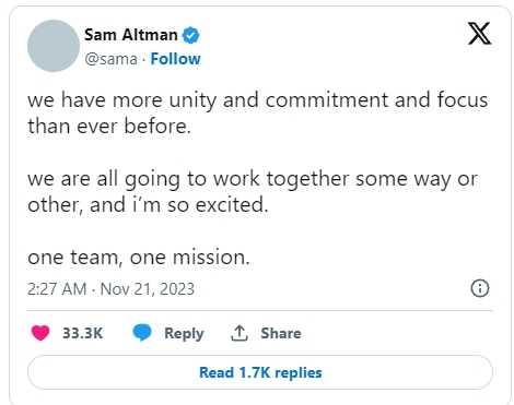 那边奥特曼和格雷格这俩小子变卦了,开始在推特上热情表白 OpenAI 团队。