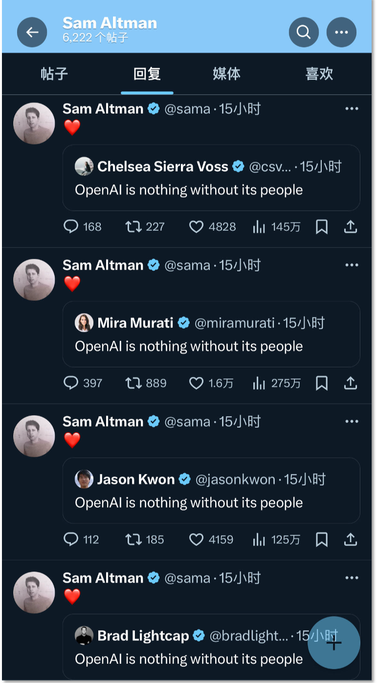 奥特曼则是忙着隔空嘲讽前司,并且支持他的 OpenAI 员工,也在推特上刷屏发布 “ OpenAI is nothing without its people ” 。