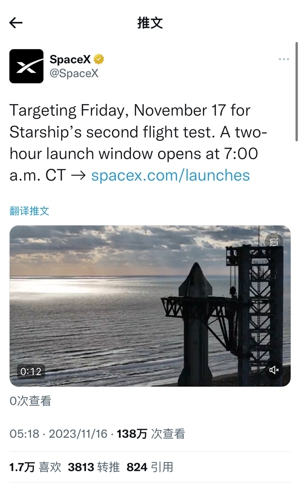 SpaceX同时宣布,计划于当地时间11月17日进行“星舰”的第二次发射,发射窗口将于美国中部时间上午7点(北京时间21点)开始,持续两个小时,当地居民可能会在火箭升空过程中听到巨大的噪音。