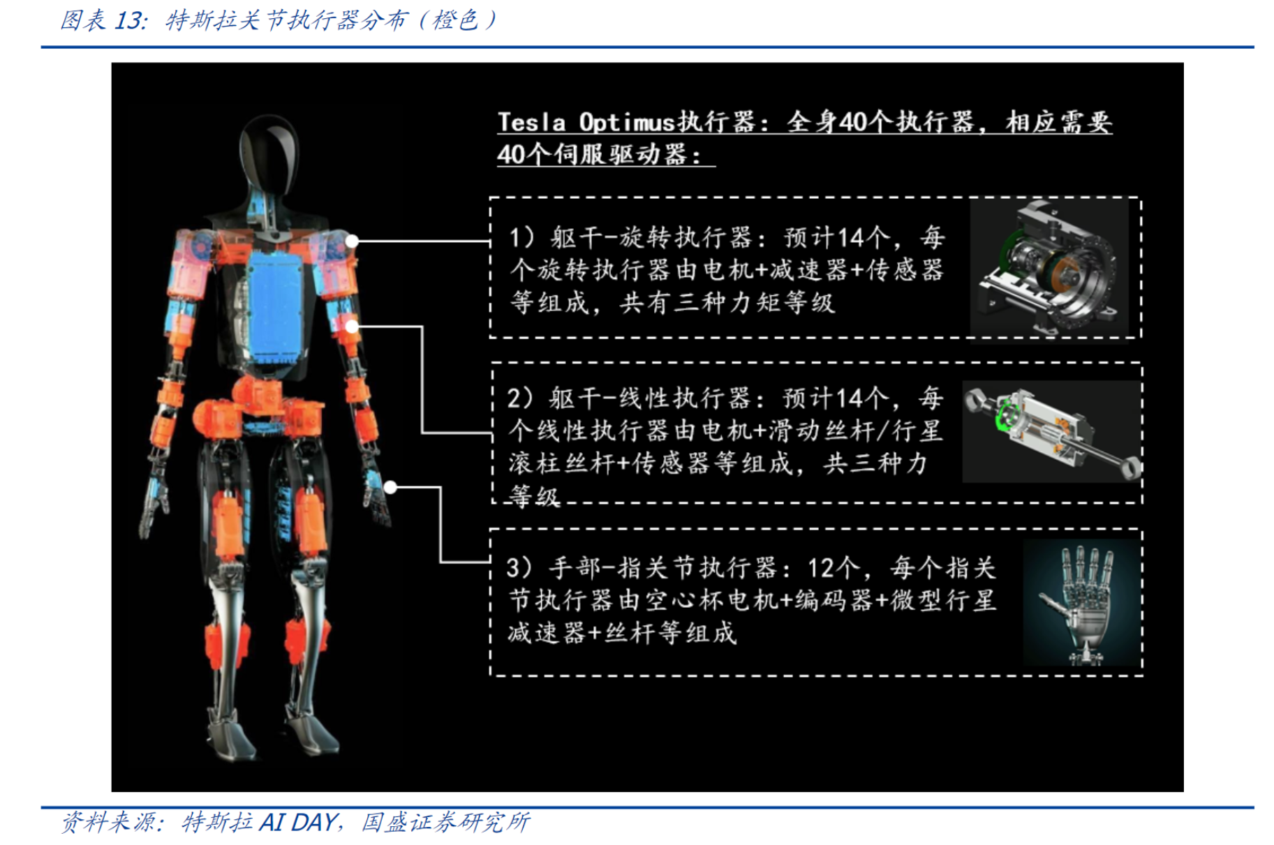 财联社7月30日讯(编辑 刘越)在特斯拉二季度财报电话会议上,马斯克提及Optimus机器人产能受限的原因主要是缺乏现成的执行器。执行器由多种零部件共同组成,其中,国盛证券近日研报指出,由于人形机器人的关节通常需要更加智能化,使得智能关节的控制与驱动环节的重要性凸显,其核心在于驱动器和驱动器芯片两个环节。