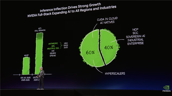 英伟达创始人兼首席执行官黄仁勋最新表示,先前他提到的AI加速芯片1万亿美元年度销售额目标,并未涵盖公司其他的产品线。 前一天,黄仁勋在主题演讲中提到,到2027年底,英伟达新一代AI加速芯片将至少创收1万亿美元。他最新的表态意味着,随着公司进军新市场,总收入将超过这一水平。 在当地时间周一(3月16日)的主题演讲中,黄仁勋展示了新一代AI计算平台Vera Rubin、Groq 3 LPU(语言处理单元)芯片、CPO交换机与太空数据中心模块,并推出NemoClaw智能体基础设施,试图构建从边缘、数据中心到轨道计算的全栈AI生态。 在当地时间周二(3月17日)的公司活动上,黄仁勋向分析师和投资者确认,英伟达预计将达成、确认并交付超过1万亿美元的业务,“对实现超过1万亿美元的营收目标充满信心”。 黄仁勋说道:“我可以确定的是:需求正以非常大的规模加速增长,而我们将能够通过供应来支持这一需求。” 尽管这一规模的收入远超潜在竞争对手所能达到的水平,但华尔街投行的分析师们担心,这一预测并未显示英伟达的营收增长正在加速。 先前,英伟达就曾预计,到2026年底,其数据中心设备销售额将达到5000亿美元;最新预测只是将时间延长一年,使累计规模翻倍。 日内,英伟达高管还提到,公司计划在今年下半年将更多现金用于回馈股东,包括股票回购和分红。 首席财务官Colette Kress称,在完成既定投资后,公司将采取这一举措,预计将把约50%的自由现金流用于股东回报。