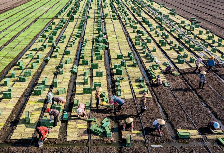 农场的育秧车间里,智能化育秧设备不停运转,恒温恒湿的环境中,“叠盘出苗+基质育秧”技术让秧苗整齐健壮,一天可育秧10万盘,满足3000亩水田需求。车间外,自走式秸秆还田机、窄行插秧机等装备整齐排列,再过不久,它们将奔赴田间,完成耕种收全程机械化作业。