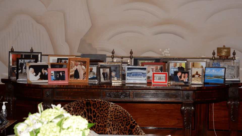 桌上的照片中,有一张装裱好的美元钞票,上面有比尔·盖茨的签名。最新曝光的邮件中包含一封未发送的邮件,邮件中爱泼斯坦似乎指控盖茨试图掩盖他感染性病的事实——盖茨称这一指控是“陷害和诽谤”他的企图。