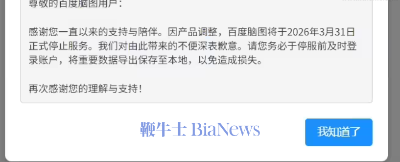 12月16日,百度脑图日前发布公告,因产品调整,百度脑图将于2026年3月31日正式停止服务。“我们对由此带来的不便深表歉意。请您务必于停服前及时登录账户,将重要数据导出保存至本地,以免造成损失。”