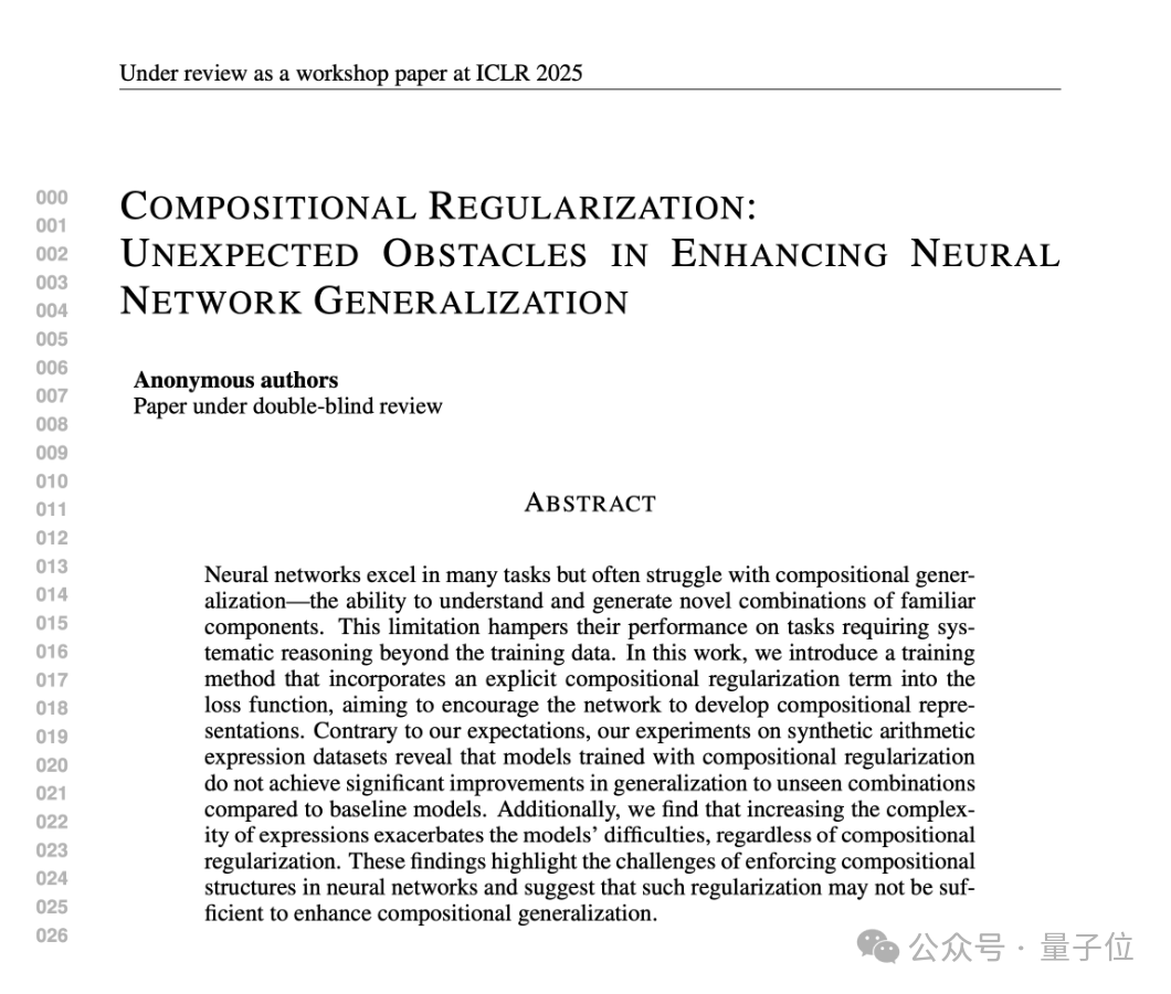 这篇论文的标题为:《组合正则化:增强神经网络泛化的意外障碍》。论文中的提出了一种旨在增强神经网络组成泛化的组成正则化方法,进行了大量实验以评估其影响,并分析了算子复杂性对模型性能的影响,讨论了组成正则化没有产生预期效益的潜在原因。