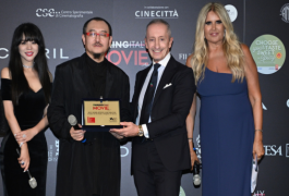 图片说明:意大利文化部电影和视听总局国际化顾问和特别项目负责人罗贝托·斯塔比勒(右2)向导演乌尔善(左2)和制片人罗珊珊(左1)在第80届威尼斯电影节期间颁发最佳艺术贡献奖。