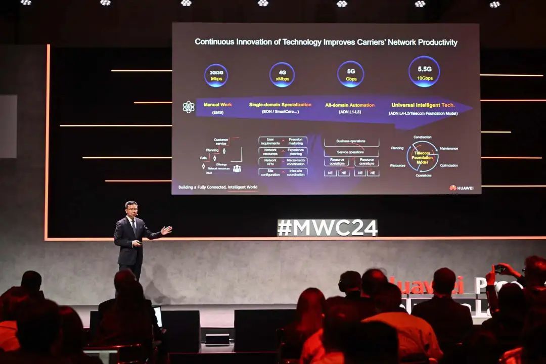 在本次MWC上,华为展出了5G-A的全系列解决方案——相比于已经商业化落地多年的5G技术,5G-A不管是在速度、时延、带宽等多方面都有所提升,是5G标准的第二阶段。华为轮值董事长胡厚崑也表示,2024年将是5G-A的商用元年。