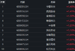 科创100指数上涨成分股中,华秦科技、高测股份、金博股份、唯捷创芯、中信博、海优新材、华峰测控、富创精密涨超1%,萤石网络、杭可科技等跟涨。