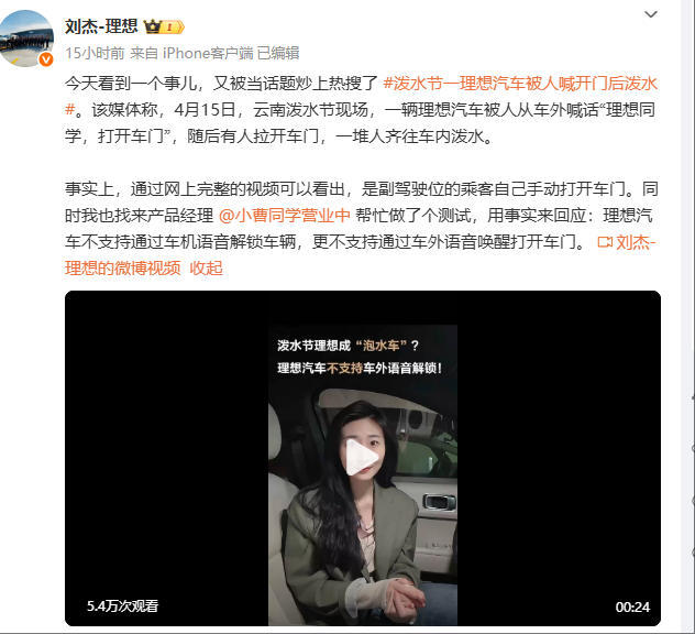 凤凰网科技讯(作者/于雷)4月18日,理想汽车副总裁刘杰就近日网传“云南泼水节理想汽车被泼成泡水车”事件发表回应,明确指出通过查看网上完整视频,事实是副驾驶位乘客自己手动打开了车门,而非网传所谓的语音解锁导致车门被打开。
