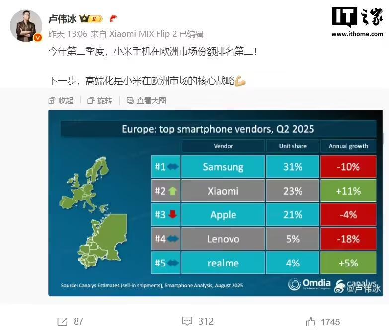 IT之家 8 月 7 日消息,小米集团合伙人、总裁、手机部总裁、小米品牌总经理卢伟冰 8 月 6 日发布微博,援引 Canalys 的市场报告称,今年第二季度,小米手机在欧洲市场份额排名第二。